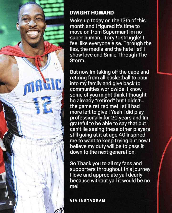 魔兽霍华德长文宣布退役 结束20年篮球职业生涯
